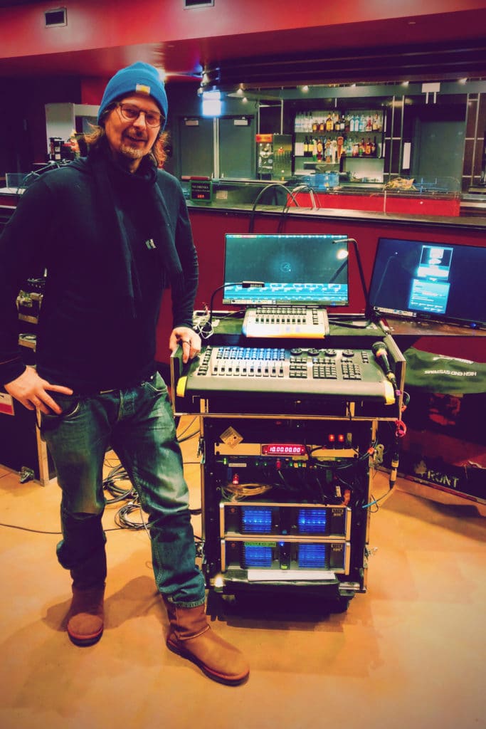 Hog 4 konnte das alles. Also entwickelte JoJo Tillmann ein Rack mit zwei Rack Hog 4und einer Nano Hog 4-Konsole. Dazu verwendete er einen Touchscreen und entwarf für den Bildschirm und die Nano Hog 4 ein spezielles Roadcase, da es als Luftfracht unter 32 Kilo Gewicht liegen musste. Problem: Sein Touchscreen wurde – damals – noch nicht von HES unterstützt. Doch das sollte sich ändern: