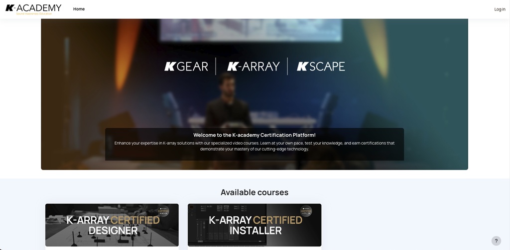 K-array verspricht für seine E-Learning-Plattform ein umfassendes Kursangebot, das Themen von Systemdesign und Installation bis hin zu Expertenwissen über verschiedene Produkttypen und Produktreihen abdeckt. Als erstes verfügbar sind die Kurse „K-array Certified Designer“ und „K-array Certified Installer“. Sie sollen AV-Integratoren und Beratern Kenntnisse für die Planung und den Aufbau integrierter K-array-Audiosysteme vermitteln und behandeln auch deren Wartung mithilfe der Softwarelösungen von K-array für Überwachung und Steuerung.