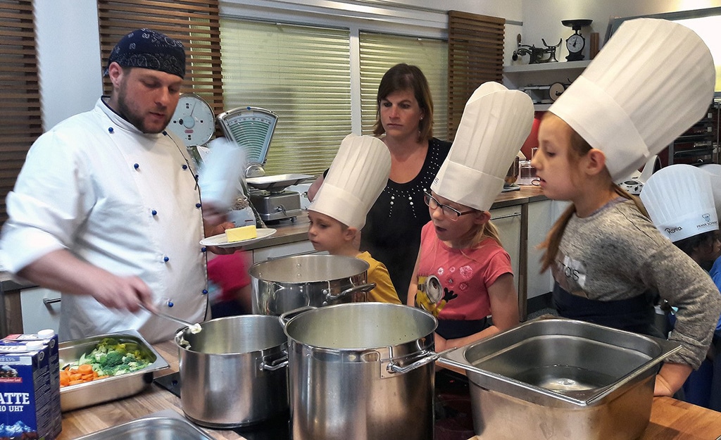 Nach dem Rundgang ging es ans Schnibbeln. Für ihr Mittagessen durften sie das Gemüse selbst waschen und zerkleinern. Auf dem Speiseplan stand überbackener Vollkornnudelauflauf mit frischem Gemüse. Bevor es zum Abschluss kindgerecht wertvolle Ernährungstipps von Laura Figura gab, stellten die Kids unter Anleitung des Profikochs noch selbst Müsliriegel aus Nüssen, Cerealien, Cranberrys mit wertvollem Bienenhonig her. Das war ein herrlich-klebriger Spaß.