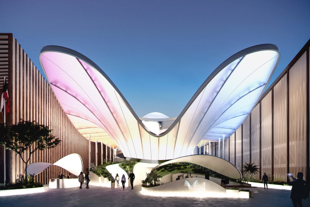 Die Architektur des Pavillons wurde vom Architekturbüro LAVA (Laboratory for Visionary Architecture) entworfen. Sie greife die Landschaft und Tradition Kuwaits auf und verwende sie als wiederkehrende Elemente im gesamten Pavillon. Die Architektur mit ihren sich öffnenden Flügeln symbolisiere eine einladende Geste und stehe für die Gastfreundschaft des Landes.