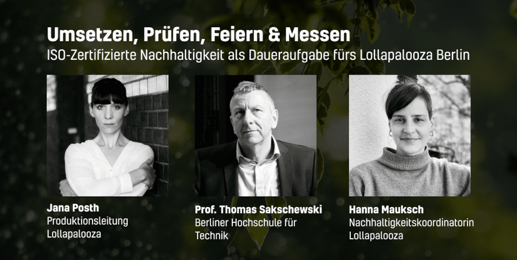 Umsetzen, Prüfen, Feiern & Messen – ISO-Zertifizierte Nachhaltigkeit als Daueraufgabe fürs Lollapalooza Berlin mit Jana Posth (Festivalleitung), Prof. Thomas Sakschewski (Berliner Hochschule für Technik) und Hanna Mauksch (Nachhaltigkeitskoordinatorin Lollapalooza)
