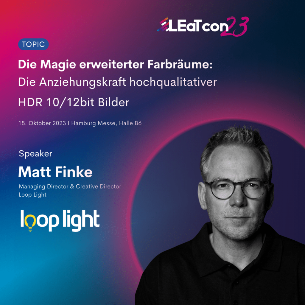 Lasst uns einen herzlichen Applaus für Matt Finke, Managing Director & Creative Director von Loop Light, bereithalten, der die Main Stage der LEaT con 2023 mit seinem Vortrag zum Thema „Die Magie erweiterter Farbräume: Die Anziehungskraft hochqualitativer HDR 10/12bit Bilder“ verzaubern und dich in die Welt der erweiterten Farbräume entführen wird.