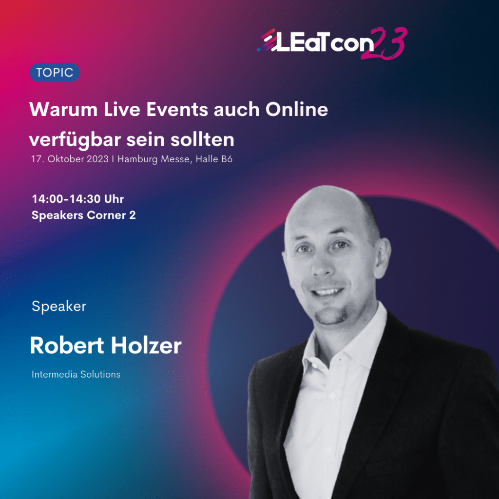 Am 17. Oktober zeigt dir Robert Holzer von Intermedia Solutions auf der LEaT con 2023, wie du die Potenziale virtueller Eventformate voll ausschöpfen kannst.