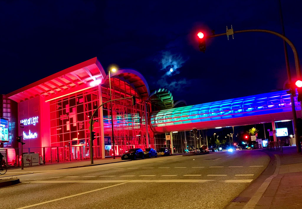 Die Hamburg Messe und Congress ließ den Skywalk von innen heraus rot beleuchten. Als tagesaktuelles Statement für Diversität und Akzeptanz leuchtete der Skywalk außerdem in den Farben des Regenbogens. SGM, europaweit erfolgreicher Anbieter von professioneller Lichttechnik, stellte das Material für die Beleuchtung der Messehalle B1 zur Verfügung. Technisch betreut wurde das Projekt von Borhen Azzouz und seinem Team von SUB-events Veranstaltungstechnik. Dirk Fröhlich von 4events stellte die Möbel für den Talk. Komplettiert wurde die Gemeinschaftsaktion von Jan Eiserloh und seinem Team der Laserfabrik aus Hürth, welche mit drei Laserprojektoren das Motto der Night of Light sowie den Restart der Eventbranche durch die LEaT con prominent auf dem Eckgebäude präsentierte.