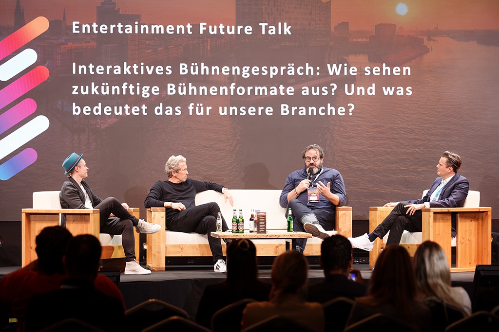 Zukunftsforscher Oliver Leisse (2.v.l.), Cedric Ebener von CE+CO (2.v.r.) und Adam Hall Geschäftsführer Alexander Pietschmann mit Moderator Sebastian Messerschmidt (l.) (Bild: Manfred H. Vogel)