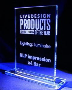 Das Live Design Magazin hat am 13. Juni in New York die GLP X4 Bar mit einem Live Design Award ausgezeichnet. „Die Idee, so viele Möglichkeiten in ein Striplight zu integrieren, ist einfach fantastisch“, lobt einer der Juroren. „Das gibt uns als Designern völlig neue Möglichkeiten – weg von der bekannten Optik eines Scheinwerfers, hin zu ungewöhnlichen Looks.“ Ein weiterer Juror lobt ebenfalls die vielseitigen Einsatzmöglichkeiten der impression X4 Bars.