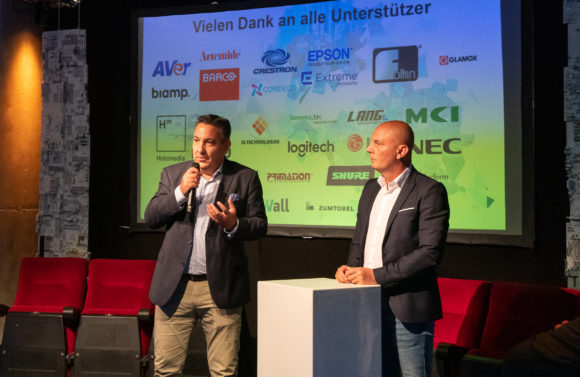 Björn Jensen, CEO der macom GmbH (r.), und Oliver Mack, Geschäftsführer der macom GmbH (l.) bei ihrer Eröffnungsrede des am 30.09.19 im Hamburger FTZ. (Bild: macom)