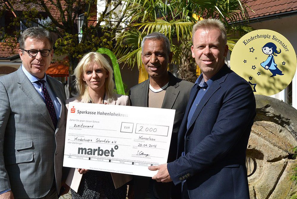 Für jeden Teilnehmer, der die fünf Minuten Zeit für die Umfrage investierte, steckte Marbet fünf Euro in die Spendenkasse und rundete die Summe auf 2.000 Euro auf. Im April übergaben dann der Bundesverband Kinderhospiz e.V.-Botschafter und Marbet Kunde Dieter Babiel (Geschäftsführer Personal der Saint-Gobain Building Distribution Deutschland) sowie Ingo Schwerdtfeger als Geschäftsführer der Marbet den Scheck an die Kinderhospiz Sterntaler-Geschäftsführerin Anja Hermann und den Leiter der Öffentlichkeitsarbeit Linnford Nnoli. Auch in Zukunft wird die Marbet bei weiteren Gelegenheiten Geld für die Arbeit des Kinderhospizes sammeln, z. B. im Rahmen der 20 Jahre Marbet Aktivitäten ab Juni 2016.