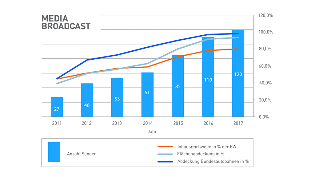 Auch in 2018 soll die Versorgung mit dem ersten nationalen Digitalradio-Multiplex weiter ausgebaut werden. Hierzu ist die Inbetriebnahme weiterer Senderstandorte geplant, welche die Mobilversorgung und insbesondere den Empfang auf Bundesautobahnen auf über 99 Prozent optimieren. Mit den geplanten Ausbaustufen steigt zudem die Inhaus-Versorgung deutlich auf über 90 Prozent der Haushalte. Details gibt Media Broadcast nach Abschluss der Planungen bekannt.