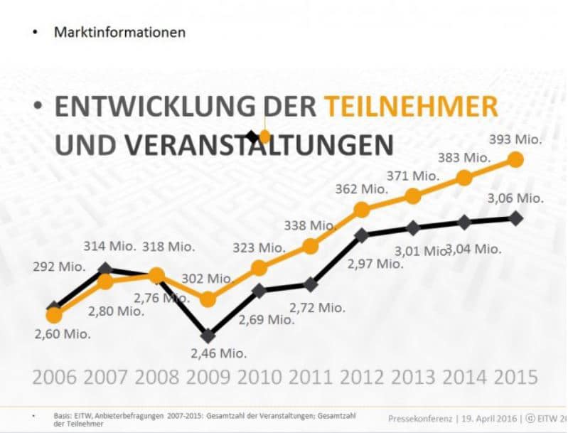 Überdurchschnittliche Nachfrage an Veranstaltungen mit Rahmenprogamm Der Anteil von Veranstaltungen mit Rahmenprogramm – das sind zum Beispiel touristische Aktivitäten, Abendveranstaltungen und Gastronomie-Besuche – ist angestiegen. Der Wert hat 2015 bei 19,2 Prozent gelegen, im Vorjahr waren es 17,7 Prozent. Düsseldorf reiht sich damit ebenfalls deutlich über dem Durchschnitt in vergleichbaren Großstädten ein, der bei 12,3 Prozent liegt. Das ist ein Beleg für die Attraktivität des Standorts, denn die Optionen, die er touristisch und im Freizeitbereich bietet, gehören offensichtlich zu den wichtigen Auswahlkriterien.