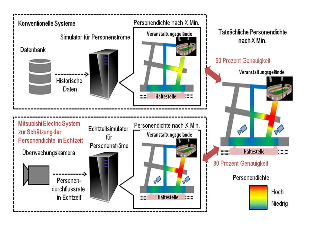 Das neue System von Mitsubishi Electric analysiert Daten aus Überwachungskameras, um kritische Personendichten auf Zu- und Abwegen von Veranstaltungsgeländen hochgenau in Echtzeit zu schätzen und vorherzusagen. (Bild: Mitsubishi Electrics)