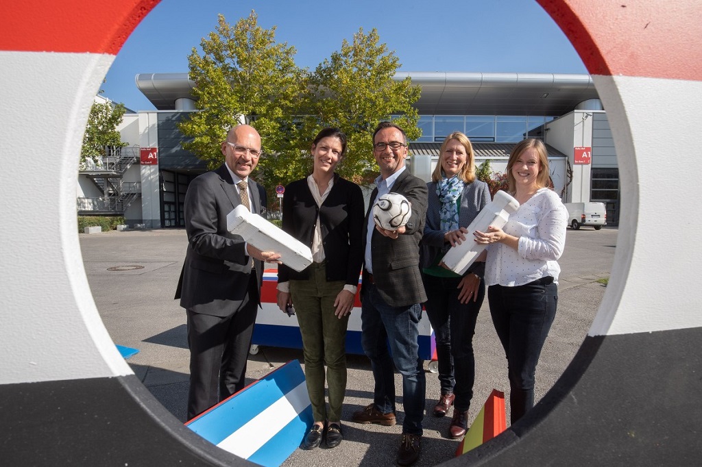 Klaus Dittrich, Viktoria von Wulffen, Norbert Blesch, Birgit Treml und Julia Sicheneder bei der Übergabe der Fußballgolf-Anlage (Bild: Oliver Bodmer/Messe München)
