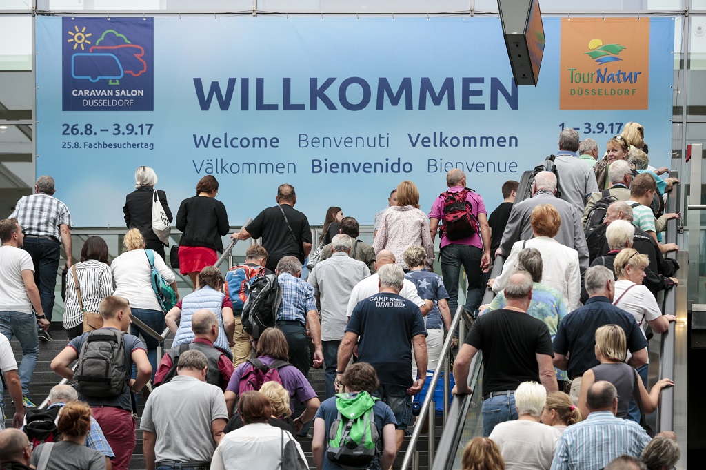 Besucher auf dem Weg zum Caravan Salon 2017; in diesem Jahr findet die Messe mit hohen Hygiene- und Sicherheitsvorkehrungen statt. (Bild: Messe Düsseldorf / ctillmann)