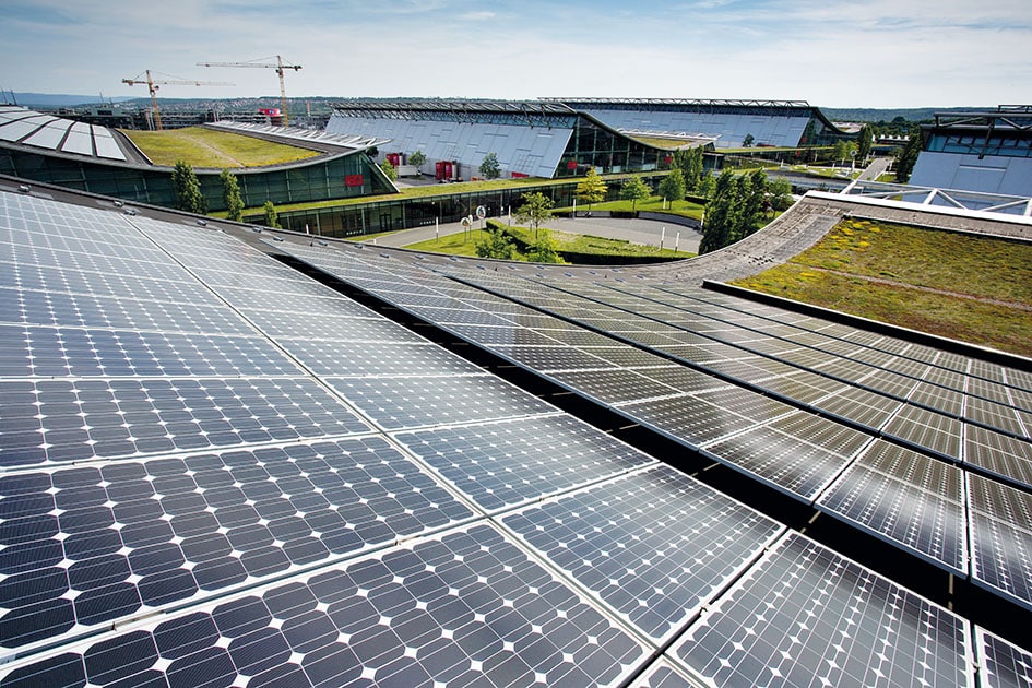 Für umweltfreundlichen Sonnenstrom sorgen Photovoltaikanlagen auf den Dächern der Messe- und Kongresshallen und des Bosch-Parkhauses. (Bild: Landesmesse Stuttgart GmbH)