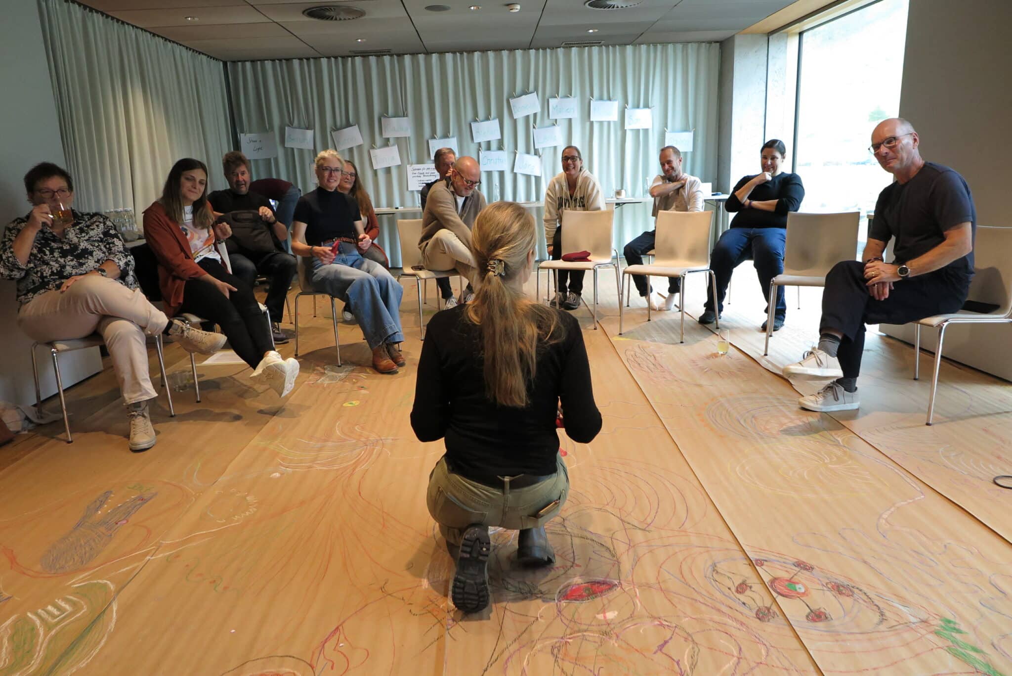 In anderen Übungen wurden die Forschenden auf einfache Weise selbst kreativ, ohne etwas „können“ zu müssen. Sie zeichneten rein intuitiv auf dem mit Packpapier ausgelegten Boden oder kreierten in Kleingruppen kurze musikalische Performances. Die damit verbundene innere Öffnung war Ausgangspunkt für Resonanz und Reflexion. Die kreativen Prozesse machten Fähigkeiten und innere Haltungen sichtbar: Offenheit, Lernbereitschaft, Gegenwärtigkeit, Bewusstsein für Komplexität, Verbundenheit, Wertschätzung, Vertrauen, Mut, Kreativität und viele mehr. Allesamt IDGs, die die Grundlage für nachhaltige Entwicklungen bilden. „Die IDG sind Qualitäten der Zukunft, ein Rahmenwerk für Entwicklung“, fasste Jörg Reckhenrich zusammen. Wichtig sei, die fünf Dimensionen Sein, Denken, Beziehung, Zusammenarbeit und Handeln nicht in ‚Silos‘ zu denken, sondern sie zu verknüpfen.