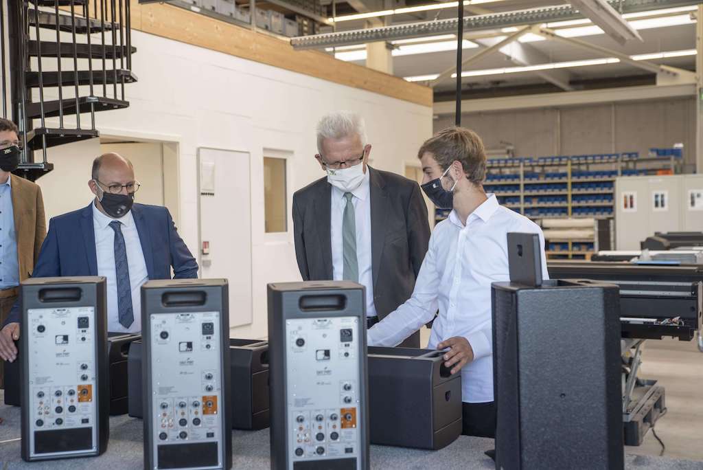 Anschließend wurde die Elektronikfertigung besucht, wo gezeigt wurde, dass alle Komponenten des Systems bis hin zur Endstufe vor Ort gefertigt werden. In der Fertigungsstraße für die Lautsprechermodelle kam auch das Thema FaceShields erneut zur Sprache. Nach Ausbruch des Corona-Virus fertigte Fohhn mit den 3D-Druckern aus dem Prototypenbau Gesichtsmasken für ein Community-Projekt. Insgesamt konnten dabei 6000 der Spezialmasken an medizinisches Personal und Hilfsorganisationen verteilt werden. Kretschmann lobte das gesellschaftliche Engagement und bedankte sich bei der Fohhn Audio AG, die eines von jenen Unternehmen gewesen sei, die das Land in der Krise mit unterstützt hätten.