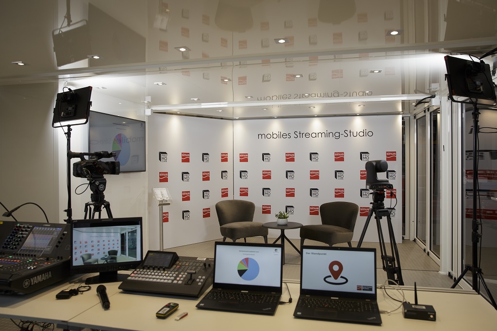 Für das mobile Studio werden lediglich eine Stellfläche von 6x5m, z.B. der firmeneigene Parkplatz, und ein 16A CEE-Anschluss benötigt. Um den Rest kümmern sich Promocube und Sinus. Zur Grundausstattung des Studios gehören zwei 4k Remote-Kameras, digitale Ton- und Videoregie, Funkmikrofone, Vorschaubildschirme, Kameralicht, Zuspieler für PowerPoint und Filme, LTE Streaming-Anbindung sowie das Fachpersonal für Kameraführung, Streamingtechnik und Tonregie.