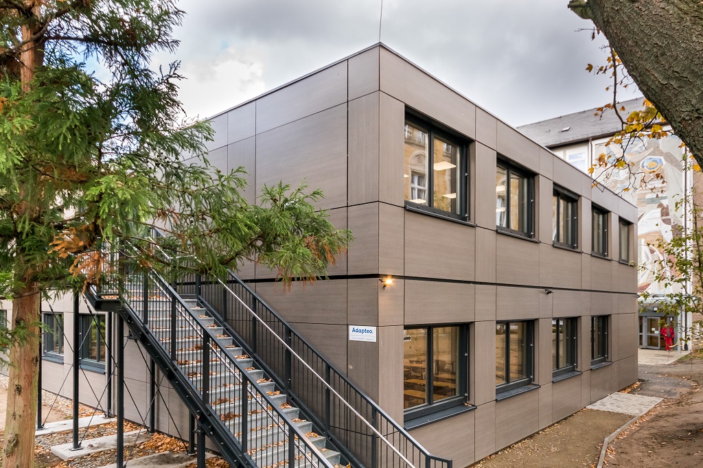 Die Adapteo GmbH aus Frankfurt am Main konzipiert, verkauft und vermietet Containeranlagen und Modulbaugebäude. Die Hybridmodule eignen sich insbesondere auch als Interimsschulgebäude. Die einzelnen Module bestehen aus einem dreidimensionalen Stahlrahmen mit Bauelementen aus wärmegedämmten Holzprofilen in Niedrigenergiehausstandard. Mit variablen Außenmaßen zwischen 6 m und 8 m bei einer Breite von knapp 3 m und einer Außenhöhe von 3,25 m erlauben sie die Errichtung dreigeschossiger Gebäude, mit einer lichten Innenhöhe von 2,75 m.