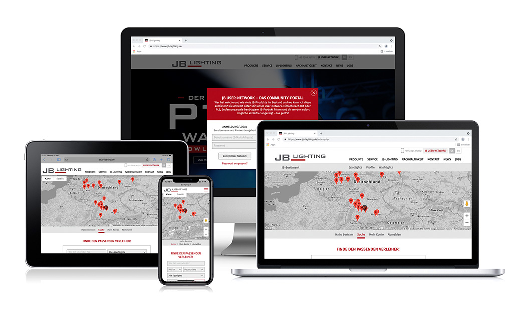 Das Herzstück dieses Portals soll – neben dem Angebot der Verleihenden natürlich – vor allem die individuelle, flexible Suche bilden. Hier soll nach einem bestimmten JB-Produkt oder auch nach einer Produktgruppe gesucht werden können. Die Suche lasse zudem mit diversen Filtern (Ort, Entfernung/Umkreis, Geräteanzahl) weiter einengen und konkretisieren. Wer sich selbst ein Bild von diesem neuen Service machen möchte oder JB-Geräte im Mietpark hat, die einer großen Community angeboten werden soll, kann sich unter www.jb-lighting.de für das JB User-Network registrieren. Sobald die Registrierung von JB-Lighting bearbeitet und der Service freigeschaltet wurde, wird der neue User per E-Mail benachrichtigt. Vermieter können nach der Registrierung und Anmeldung über das Konto das eigene JB-Equipment hinterlegen, speichern und so für alle in der Community „sichtbar“ machen.