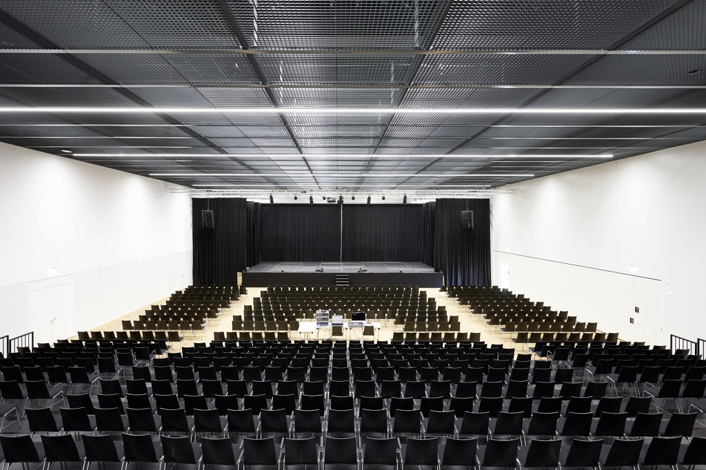 Das Foyer, an das sich ein Cateringbereich mit Theke und Lager anschließt, ist in zwei voneinander abtrennbare Bereiche mit Größen von 354 m² und 135 m² unterteilt und kann so auch für kleinere Teilnehmergruppen genutzt werden. Das Herz der neuen Stadthalle ist der stützenfreie, fast 900 m² große, multifunktionale Veranstaltungssaal mit acht m Raumhöhe, 25 m Breite und 35 m Länge. Die 180 m² große Bühne ist nicht fest installiert, sondern lässt sich aus verschiedenen Elementen je nach Bedarf flexibel zusammenfügen. Dank mobiler Trennwände kann zudem das Foyer zum Veranstaltungsraum hinzugefügt werden, sodass sich Sitzplätze für bis zu 900 Personen arrangieren lassen. Stehend finden bis zu 1.600 Teilnehmer Platz. Außerdem können Bestuhlungsszenarien mit Tribüne und aufsteigender Bestuhlung im hinteren Bereich der Halle realisiert werden.