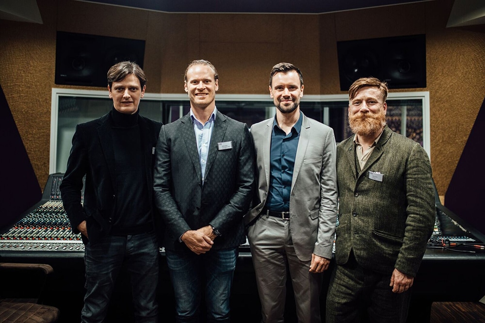Die Begrüßungsredner bei der offiziellen Eröffnungsfeier: Chris Müller (Geschäftsführer SAE Institute DACH), Scott Jones (CEO SAE Institute Global), Felix Falk (Geschäftsführer BIU – Bundesverband Interaktive Unterhaltungssoftware e.V.), Peter Duhr (Manager SAE Institute Berlin, v.l.n.r.) (Bild: SAE Institute)