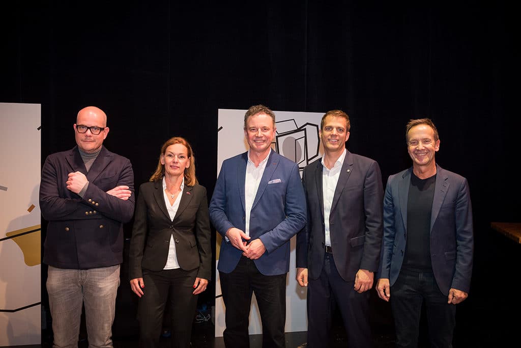 Die Initiatoren des neuen Brand Ex Festivals: Jan Kalbfleisch (Geschäftsführer FAMAB e.V.), Sabine Loos (Hauptgeschäftsführerin Westfalenhallen Dortmund GmbH), Rudolf Watzlawek (Sales Manager BlachReport), Jörn Huber (Vorstandsvorsitzender FAMAB Kommunikationsverband e. V.) und Michael Hosang (Geschäftsführer Studieninstitut für Kommunikation) (v.l.n.r.) (Bild: FAMAB / Peter Jammernegg )
