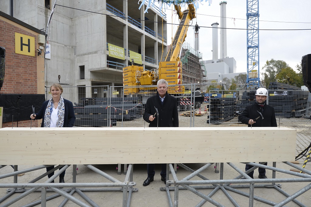 Richtfest für die Interimsphilharmonie Gasteig Sendling: (v.l.n.r.) Annette Löber, Architekturbüro GMP, Dieter Reiter, OB München, und Andy Böckli, Nüssli (Bild: Bernhard Faber / Robert Haas)