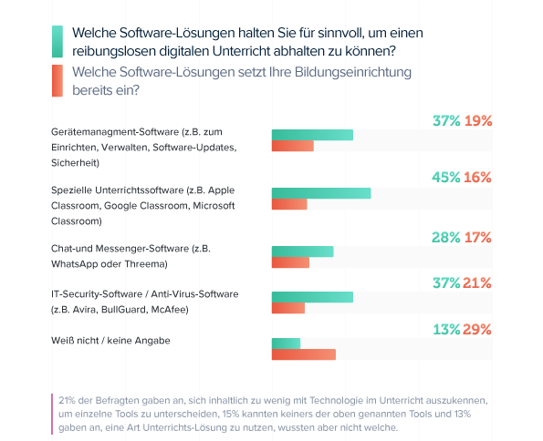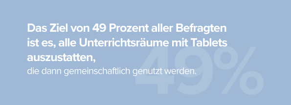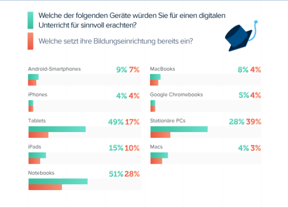 Bei den Arbeitsmitteln, die laut Umfrage für den digitalen Unterricht als sinnvoll erachtet werden, setzt sich mit 51 Prozent knapp das Notebook durch, gefolgt vom Tablet mit 49 Prozent. Den dritten Platz belegen stationäre PCs mit 28 Prozent. Obwohl im Umgang als weniger hilfreich erachtet, werden diese am häufigsten einsetzt: 39 Prozent der Bildungseinrichtungen nutzen stationäre PCs, Tablets sind gegenwärtig nur zu 17 Prozent im Einsatz.