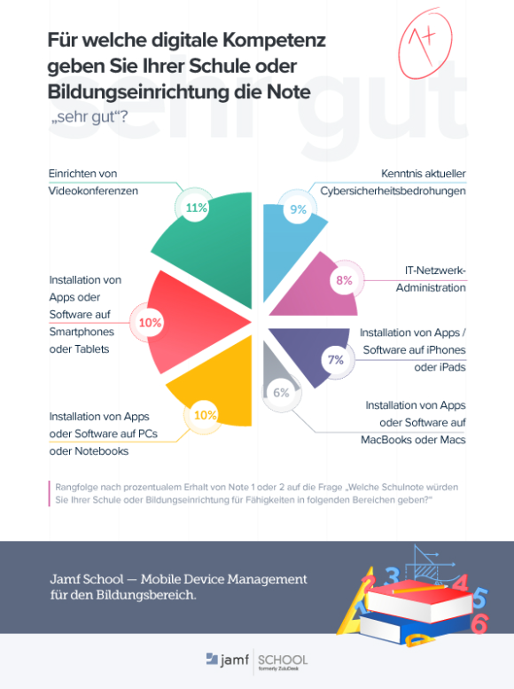 Das Jahr 2020 dürfte als Ausnahmejahr an deutschen Schulen und Universitäten in die Geschichte eingehen. Der verordnete Lockdown machte vielen Lehrenden klar, dass in Sachen Digitalisierung noch viel zu tun ist. Studieninitiator Jamf bat um ein erstes Fazit und stellte die Frage: „Wäre Digitalisierung ein Unterrichtsfach, welche Schulnote würde ihre Bildungseinrichtung am Ende dieses Schuljahres oder Semesters erhalten?“ 29 Prozent der Befragten würden Ihre Einrichtung mit Note 1 oder 2 bewerten. Die Top Note 1 erhalten nur neun von 100 Einrichtungen. 15 Prozent stellen die Note 5 oder 6 aus.