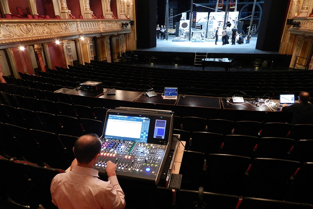 Statt der bisherigen Lösung mit einem Lawo mc²66 kommen in der Tonregie und im Saal jetzt jeweils ein mc²56 zum Einsatz, wobei Tonregie- und Saalpult als Spiegelpulte konzipiert sind. Im Spiegelbetrieb der Konsolen sind Konfigurationen, Snapshots und Anpassungen der Parameter, die an einem Pult eingespielt oder vorgenommen werden, auch am anderen Pult abrufbar. Dadurch kann eine effiziente Vorbereitung von Aufführungen, bei denen vermehrt Mikroport-Systeme zum Einsatz kommen, gewährleistet werden. Die in der Zukunft geplanten Musical- und Kinderoperprojekte können so leichter im Saal abgemischt werden.