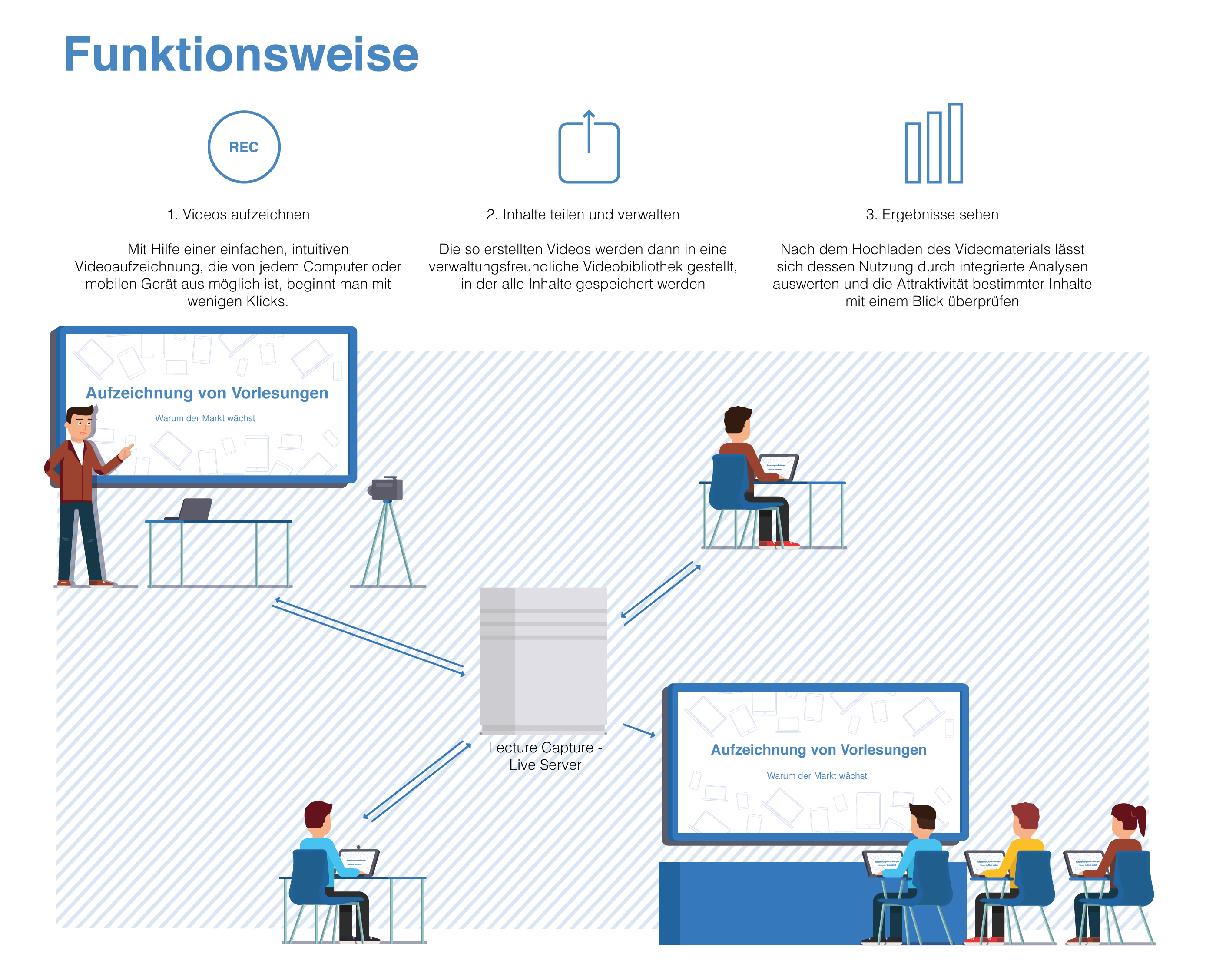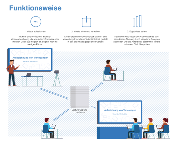 Mit Lecture Capture können Bildungsinstitutionen Unterrichtsstunden und Vorlesungen aufzeichnen und als Digitalversion zum Live-Streaming oder zum Download online bereitstellen. Unternehmen können Mitarbeiter so komfortabel digital schulen, zum Beispiel bei der Einarbeitung, bevorstehenden Gesetzesänderungen, Produktschulungen oder Vorträgen.