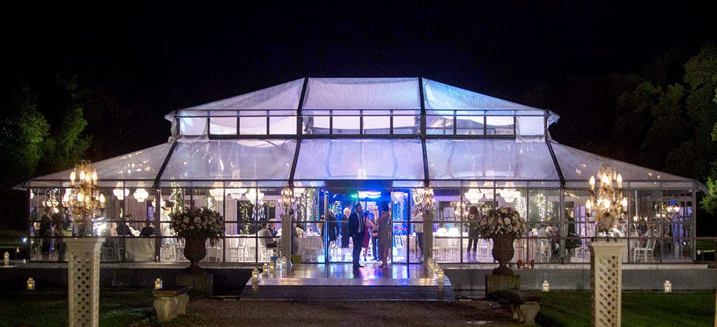 PBI Event Architecture ist mit seinen Zeltsonderbauten Teil der Hochzeitskomödie “Das Leben ist ein Fest”. Das belgische Unternehmen ist spezialisiert auf die Installation und Vermietung von Orangerien. Für diese Produktion wurde eigens ein Unterbaugerüst in den Teich gebaut. Auf der dadurch entstandenen Plattform wurde eine rund 200 m² große Orangerie mit zweistufigem, transparentem Dach errichtet. Über eine Brücke erreichen die Gäste die Hochzeitslocation.