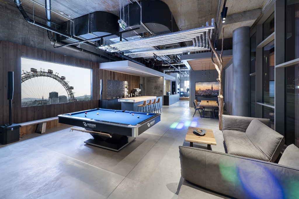 „Im Büro der Zukunft geht es um Reminder. Ein Office ist längst mehr als ein Arbeitsraum. Es wird zur Bühne, zur Werbe- und Präsentationsfläche. Und dafür braucht es das gewisse Etwas, woran sich der Kunde noch Monate später erinnert, weil er es nicht erwartet hat“, erklärt Interieurdesignerin Judit Boros. „Ein Punkt, der in den Jahren der Großraumbüros oft vergessen wurde. Wer arbeitet, braucht das Gefühl von Sicherheit“, so die Interieurdesignerin. Die tiefer gesetzte Decke der Halle ziehe sich weiter zur Bar. Gegenüber verfüge der Raum über ein Besprechungsareal mit einem 86‘‘ Touch-Screen an der Wand an der Stirnseite eines Holztisches.
