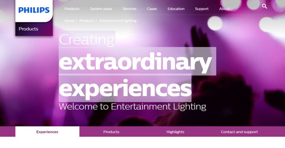 Startpunkt der Webseite ist ein klar strukturierter “Produktfinder”, aber natürlich finden sich im Menü auch die gängigen Bereiche Services, Support und Kontakt. Zudem unterstreicht die Webseite mit der Kategorie “Education” und “Cases” den Bildungsauftrag, den Philips Lighting bedienen möchte: