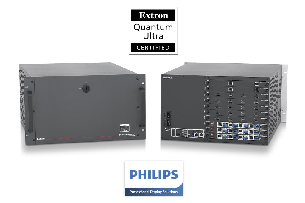 In Verbindung mit den Extron Quantum-Ultra- und Quantum-Ultra-II-8K-Videowall-Prozessoren sind nun ausgewählte Modelle der Philips X-Line-Displayserie von PPDS für eine konsistente, stabile Darstellung von Quellinhalten zertifiziert. Diese Videowall-Displays haben das Testprogramm von Extron bestanden und sind nun als „Quantum Ultra Certified“ gekennzeichnet.