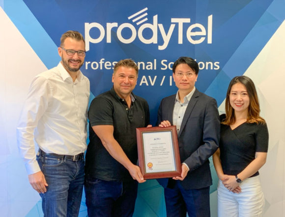 Jason Yang, Aoto EMEA Sales-Direktor und Angela Lee, Overseas Sales Manager EMEA bei der Übergabe der Partner-Urkunde (Bild: prodytel)