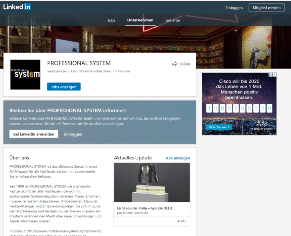 Unter linkedin.com/company/professional-system kann man nun die News-Seite des erfolgreichen Magazins für professionelle AV-Technik in der Systemintegration finden und PROFESSIONAL SYSTEM folgen um zukünftig News und Artikel auf der eigenen Startseite angezeigt zu bekommen. Also folgen Sie uns und lassen Sie sich von uns informieren.