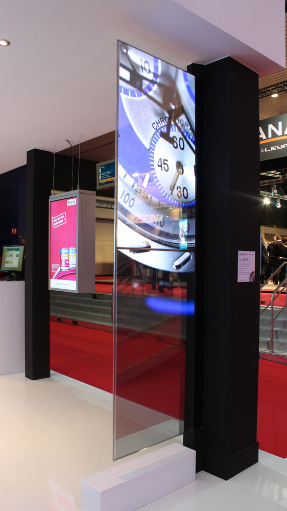 Als Hingucker soll ein Aufbau mit zwei übereinander verbauten transparenten OLED Modulen vom Typ Eye-Toled-5500 die Besucher auf den Messestand locken und sich als kreative Lösung für außergewöhnliche Präsentationen vorstellen. Überall dort, wo schwarze Bildinhalte dargestellt werden, zeigt sich das 55 Zoll große OLED-Display transparent, während die aktiven Bildpunkte selbstleuchtend mit brillanten Farben aufwarten sollen.