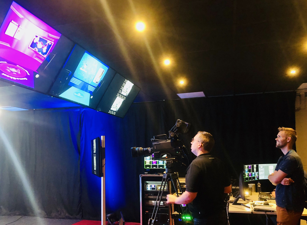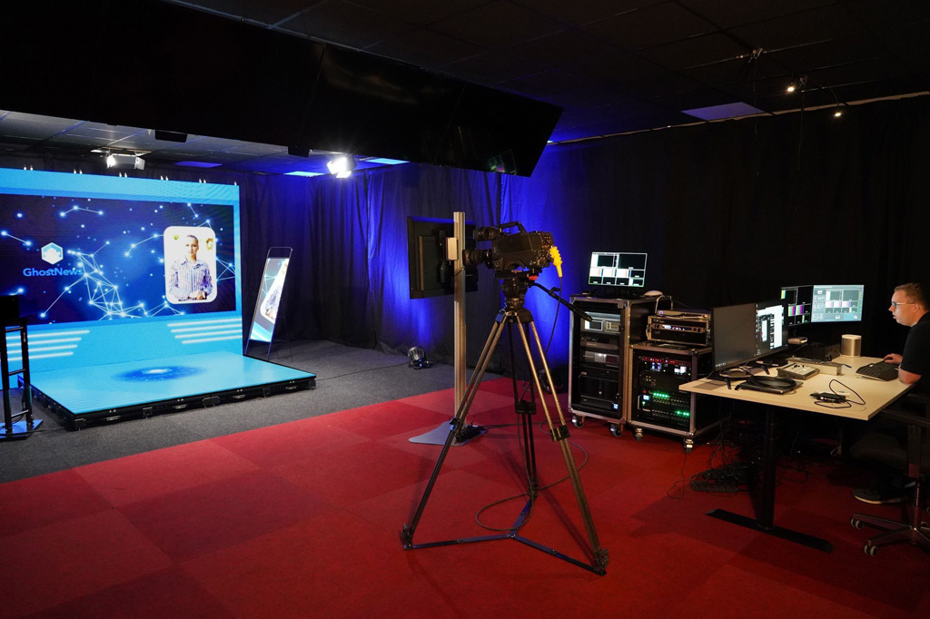 Das Studio wird mit zusätzlicher Beleuchtung, einem Medienserver, einem Broadcast-Switcher und Kameras vervollständigt. Vier 50-Zoll-Monitore werden genutzt, um die Visualisierung der kamerainternen Bilder, wie z. B. die GhostFrame-Feeds, zu erfassen.
