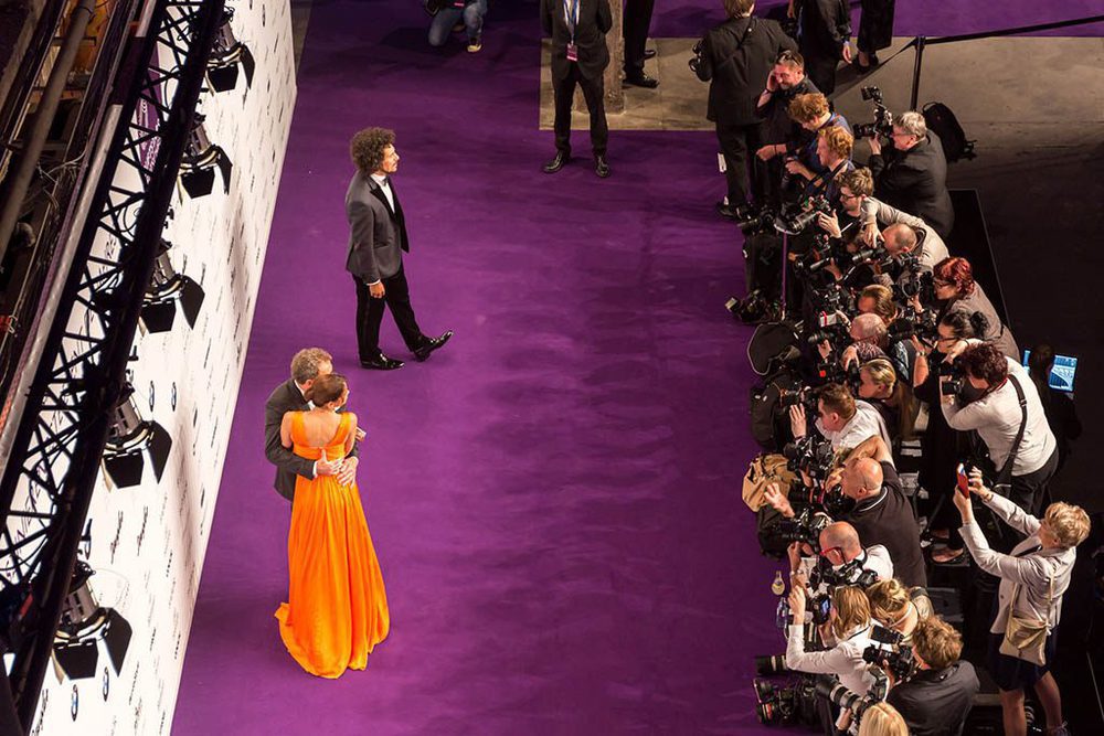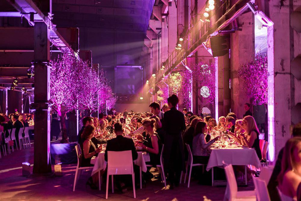 Im Erdgeschoss rollte Satis&fy 1000 Quadratmeter lila Teppich aus und stellte die 120 Quadratmeter große Pressewand auf. Außerdem wurden diverse Lampen in Position gebracht. Für die Preisverleihung im Obergeschoss des Kraftwerks installierte man eine temporäre Tribüne aus Layer-Elementen, ein 60 Tonnen Stahl-Schwergewicht, um ausreichend Platz für die 800 Gäste zu schaffen. Für das Rampenlicht wurden 48 Platinum FLX Scheinwerfer von Elation, die kürzlich erst in den Materialpool der Firma aufgenommen wurden, und 26 Impression X4 von GLP auf der Bühne zum Einsatz gebracht. Den Dinner-Bereich im Obergeschoss leuchtete satis&fy mit Expolite Akku Scheinwerfern, Castor 2000 Stufenlinsen, 6er bar Par 64 Scheinwerfern und Zoom Profiler atmosphärisch aus.