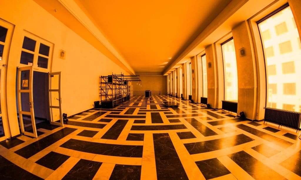 In den letzten Wochen hat ein Team von Satis&fy den Abs-Saal für seine letzten Tage modernisiert und größere Umbauten vorgenommen. Der einst helle Saal wurde in tiefes Schwarz getaucht. Optisches Highlight im Raum: ein aus schwarzen Würfeln kaskadenartig zusammengesetzte Rückwand, die eine variable mediale und digitale Bespielung mit Videokunst ermöglicht. Konventionelles Licht wurde gegen LED-Lampen ausgetauscht. Die perfekte Ausleuchtung lässt den Stil der Location jetzt noch besser zur Geltung kommen.  Neu ist auch die Tonanlage. Um die Akustik in den Griff zu bekommen, wurden die Wandverkleidungen mit Akustikpanelen ergänzt und zusätzlich mit schwer entflammbaren Stoffen erneuert. Die großen Fenster im Foyer wurden mit orangener Folie abgeklebt, um zu verhindern, dass tagsüber zu viel Licht ins Innere eintritt.
