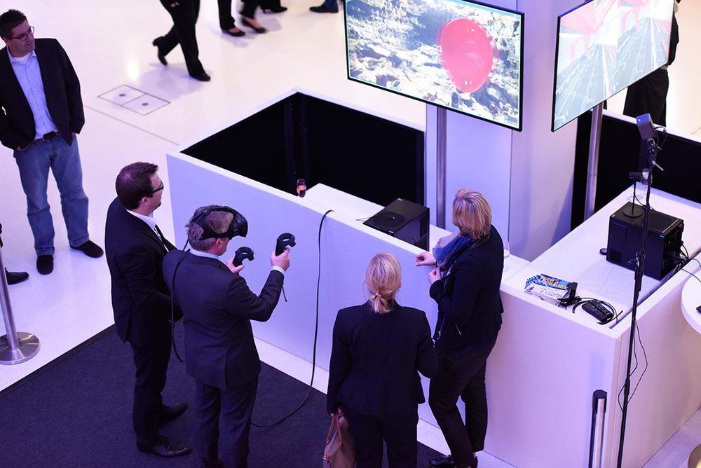 Zur Eröffnung gab es eine Leistungsschau aus dem Bereich Videotechnik. So begeisterte der Intellifridge, der erste in Zusammenarbeit mit LG Electronics entwickelte multimediale Kühlschrank, nicht nur mit seinem Inhalt, sondern auch mit seinem als Präsentationsfläche genutzten Äußeren. Außerdem hatte die Gäste die Möglichkeit, über eine VR Brille in die dreidimensionale Welt des Congress Centrums einzutauchen. „VR Brillen werden auch in der Veranstaltungswelt immer mehr an Attraktivität gewinnen“, äußert sich Busch und wies darauf hin, dass das MCC Halle Münsterland in eine VR-Station investieren werde. „Wir übernehmen dann die Visualisierung für Veranstaltungen“, ergänzt er. Des Weiteren wurden ein transparenter OLED Touch Display, eine Puffersphere und ein digitaler Tischkicker ausgestellt.