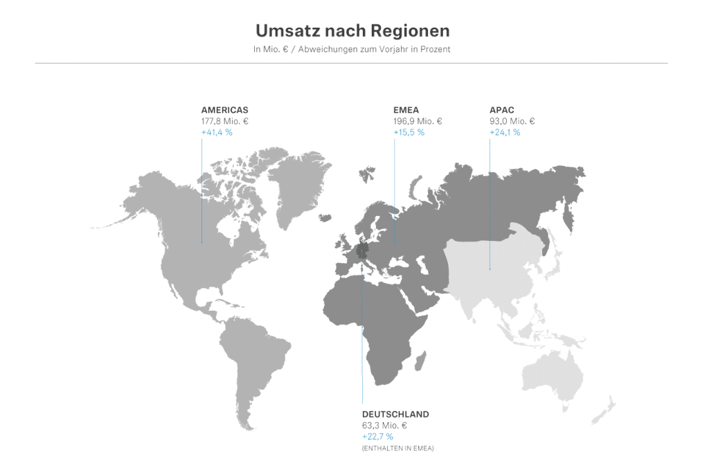 Im Jahr 2022 erzielte die Region EMEA mit 196,9 Mio. Euro weiterhin den größten Umsatz. Im Heimatmarkt Deutschland erzielte Sennheiser einen Umsatz von 63,6 Mio. Euro. In der Region APAC erwirtschaftete Sennheiser einen Umsatz von 93 Mio. Euro und in der Region Americas einen Umsatz von 177,8 Mio. Euro. Nicht enthalten ist der Umsatz aus dem Consumer-Segment.