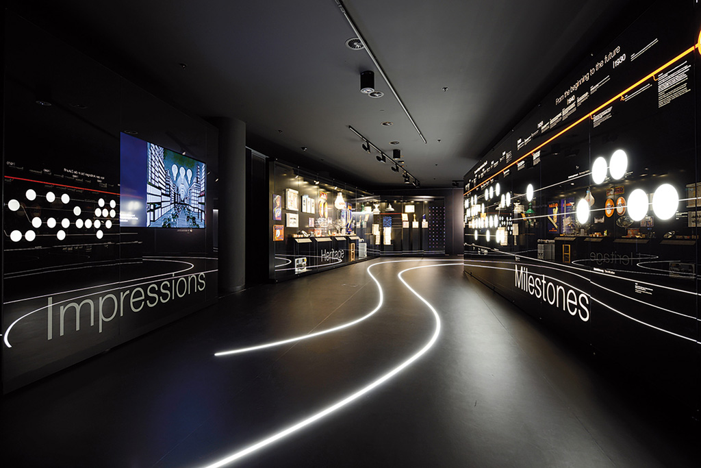 Der flexible, anspruchsvoll inszenierte Showroom zeigt das Kompetenz- und Produktspektrum der Osram Licht AG und präsentiert das Unternehmen als High-Tech-Anbieter mit über 100-jähriger Tradition. Auf zwei Ebenen entstand eine Infotainment-Welt mit Lichtkino, Audio- und Video-Inhalten, vielfältigen Licht-Einheiten und Nebeleffekten. In einer Light Box wird Licht emotional erlebbar – eine Zeitachse der Lichttechnik dokumentiert die Meilensteine der Entwicklung. Im Erdgeschoss sorgt ein bewegliches Glas-Trennwandsystem für unterschiedliche Raumvarianten: offen als Areal für Pressekonferenzen und Großevents, geschlossen als vielseitiger Workshop-Bereich.