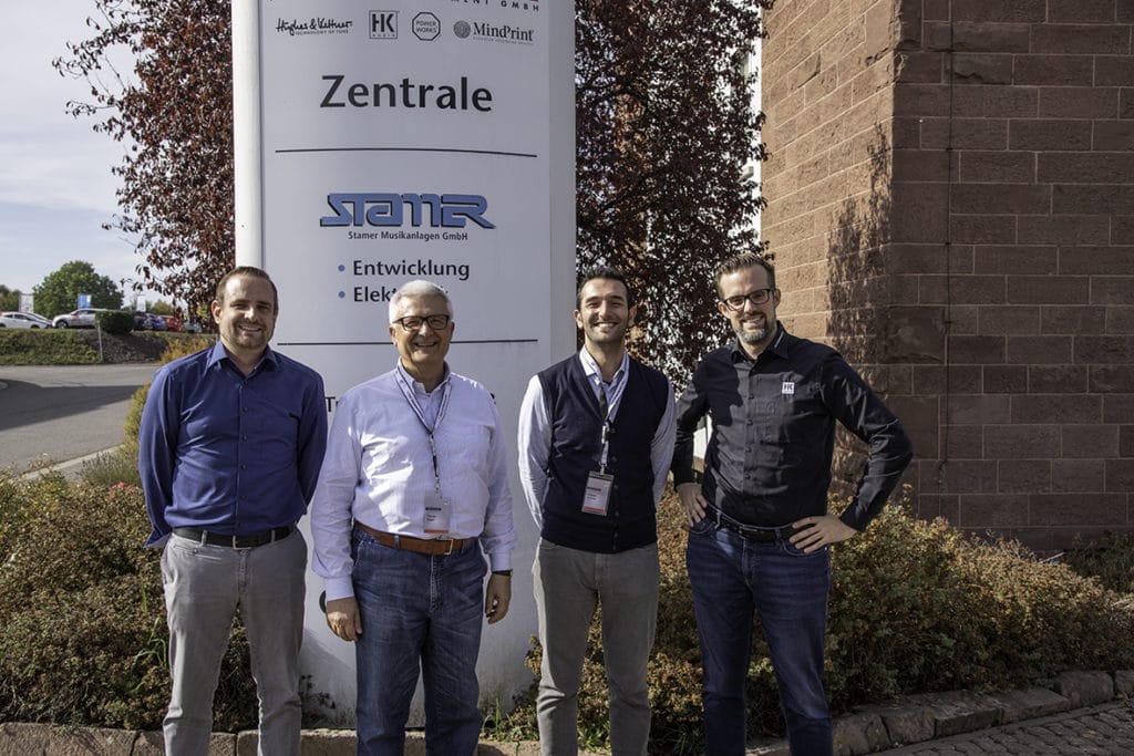 Christian Jordan (Leiter Export HK Audio), Claudio Bugari (CEO Sisme), Antonio Sciarrillo (Produktmanager HK Audio bei Sisme), Nils Stamer (CEO HK Audio) (Bild: HK Audio)