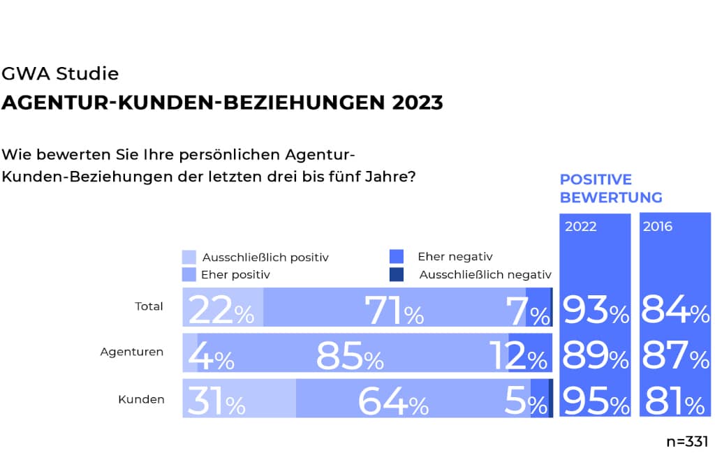 Die Ergebnisse einer Studie zu Agentur-Kunden-Beziehungen von GWA und Innofact ergeben, dass die Beziehungen zwischen Agenturen und ihren Kunden von beiden Seiten aus heute als gut und deutlich besser als noch vor einigen Jahren bewertet werden. Zudem wandle sich das Rollenverständnis vom Dienstleister- zu einem partnerschaftlichen Verhältnis. Nachhaltigkeit sowie Vielfalt sollen in der Zusammenarbeit außerdem an Bedeutung gewinnen.