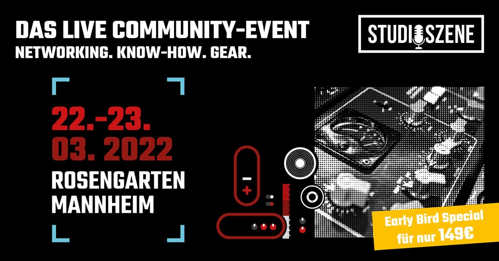 Unsere Kollegen von Sound & Recording veranstalten am 22. & 23. März die Studioszene im Mannheimer Rosengarten. Sichere dir jetzt eines von auf 500 limitierten Early-Bird-Tickets zum Preis von 149 €. Mit dem Early-Bird-Ticket sparst du 50 € auf den regulären Preis eines Zwei-Tages-Tickets. Damit erhältst du Zugang zum gesamten Programm mit allen Masterclasses, Workshops, Diskussionsrunden und zum Ausstellerbereich. Die Early-Bird-Phase endet am 31.01.2022.