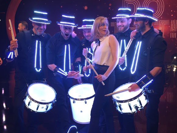 Gesine Cukrowski in der ZDF-Show “I can do that” mit den Light Drummern von Sanostra. (Bild: Sanostra)