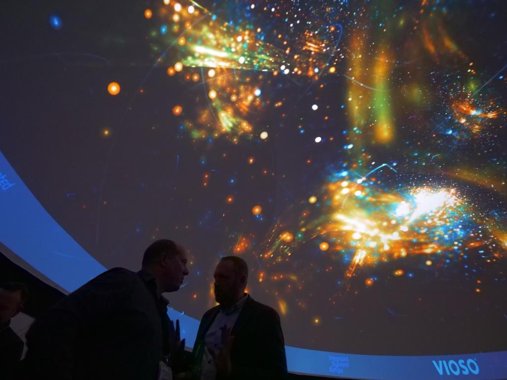 Der doppelwandige, aufblasbare, 75 m² große Airdome VR, der von airstructures.de bereitgestellt und hergestellt wird, nimmt eine sphärische Projektionsoberfläche von 360°×180° ein. Die schallisolierte Struktur mit einem Durchmesser von 10 Metern und einer Höhe von 5 Metern befindet sich vor dem Eingang zu Halle 8. Vioso wird in diesem Airdome seine neueste Kalibrations- und Warping/Blending-Software vorstellen. Durch fünf 4K-Projektoren von Barco erreicht der Airdome eine Gesamtauflösung von über 6K.