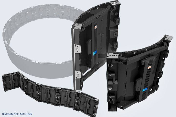 Die technischen Besonderheiten des neuen Rental-Materials erklärt vision tools LED-Produktmanager Vincent Stuedemann genauer: „Wer auf der diesjährigen Integrated Systems Europe in Amsterdam den Aoto Gtek Stand besucht hat, konnte sich von der extremen Flexibilität der Produkte überzeugen. Das neue InnoPad C2.9 wurde beispielsweise in Form einer Welle präsentiert und genau diese Biegsamkeit macht das LED-Material für uns so interessant. Der Konfigurationsradius der Paneele reicht von 22,5 bzw. 45 Grad bis 90 Grad. Das Spezielle hierbei: Sowohl InnoPad als auch InnoPix II sind auf Cabinet-basis curvebar, können aber auch ‚flat‘ installiert werden. Somit sind für den Indoor-Bereich und für Outdoor-Applikationen besonders kreative und ausgefallene Installationen möglich.“